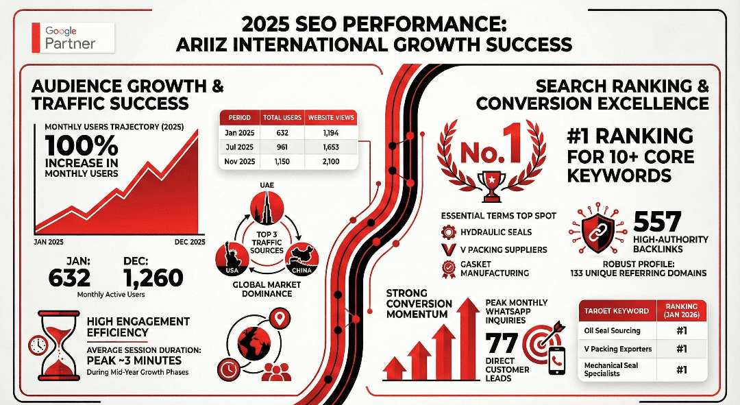 The SEO campaign delivered consistent growth throughout 2025. By January 2026, Ariiz International achieved #1 rankings for high-value keywords, including oil seal sourcing, V-packing exporters, industrial sealing solutions, and wiper seal suppliers. Monthly website users more than doubled, rising from 632 users in January 2025 to a peak of 1,765 users in November 2025, with organic search becoming the primary acquisition channel. Increased visibility translated into measurable business impact, including 77 WhatsApp enquiries in a single month, supported by steady phone and form enquiries.