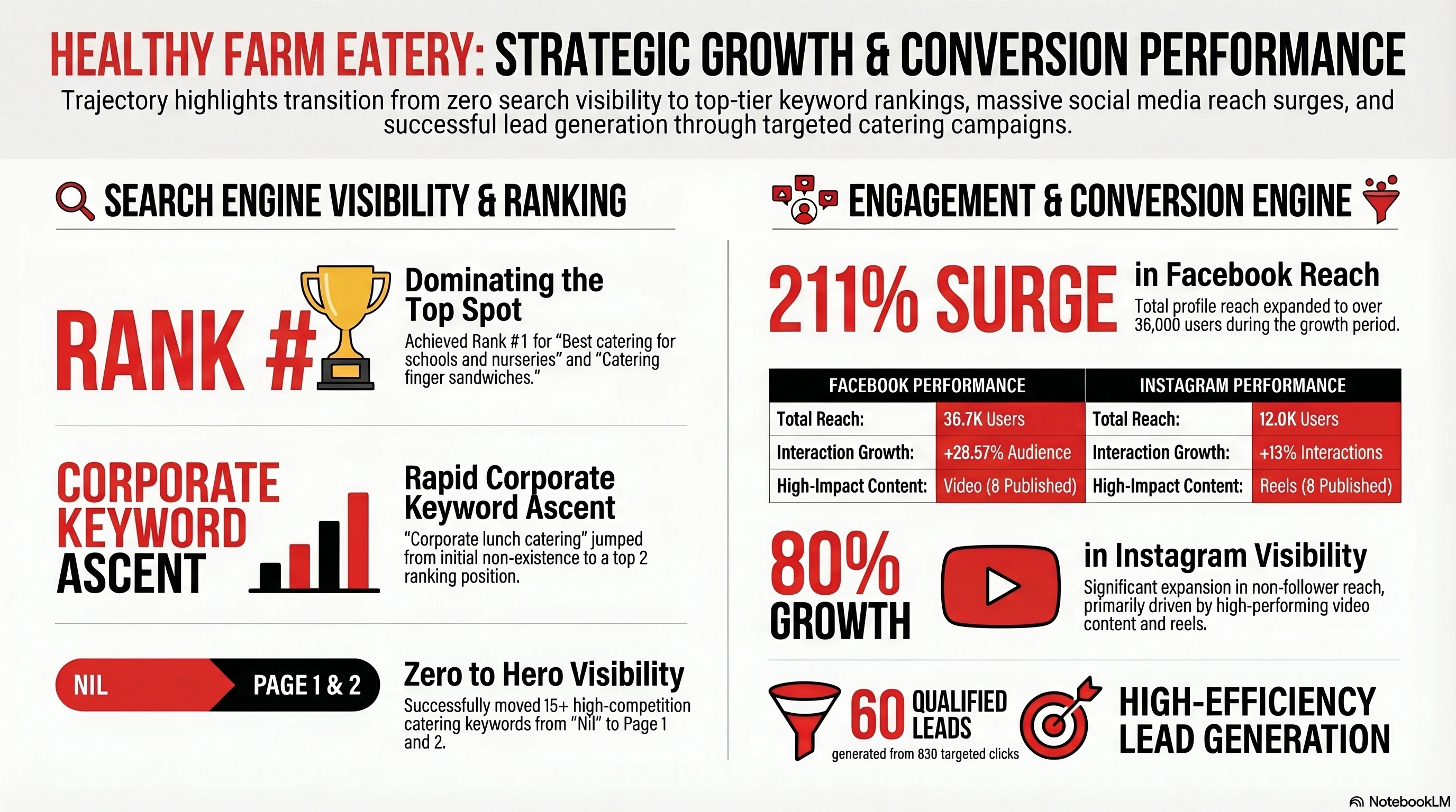 The integrated digital strategy delivered strong and measurable growth across all key channels. Healthy Farm Eatery experienced a significant improvement in online visibility, audience reach, and overall engagement, strengthening its position in the competitive catering market.